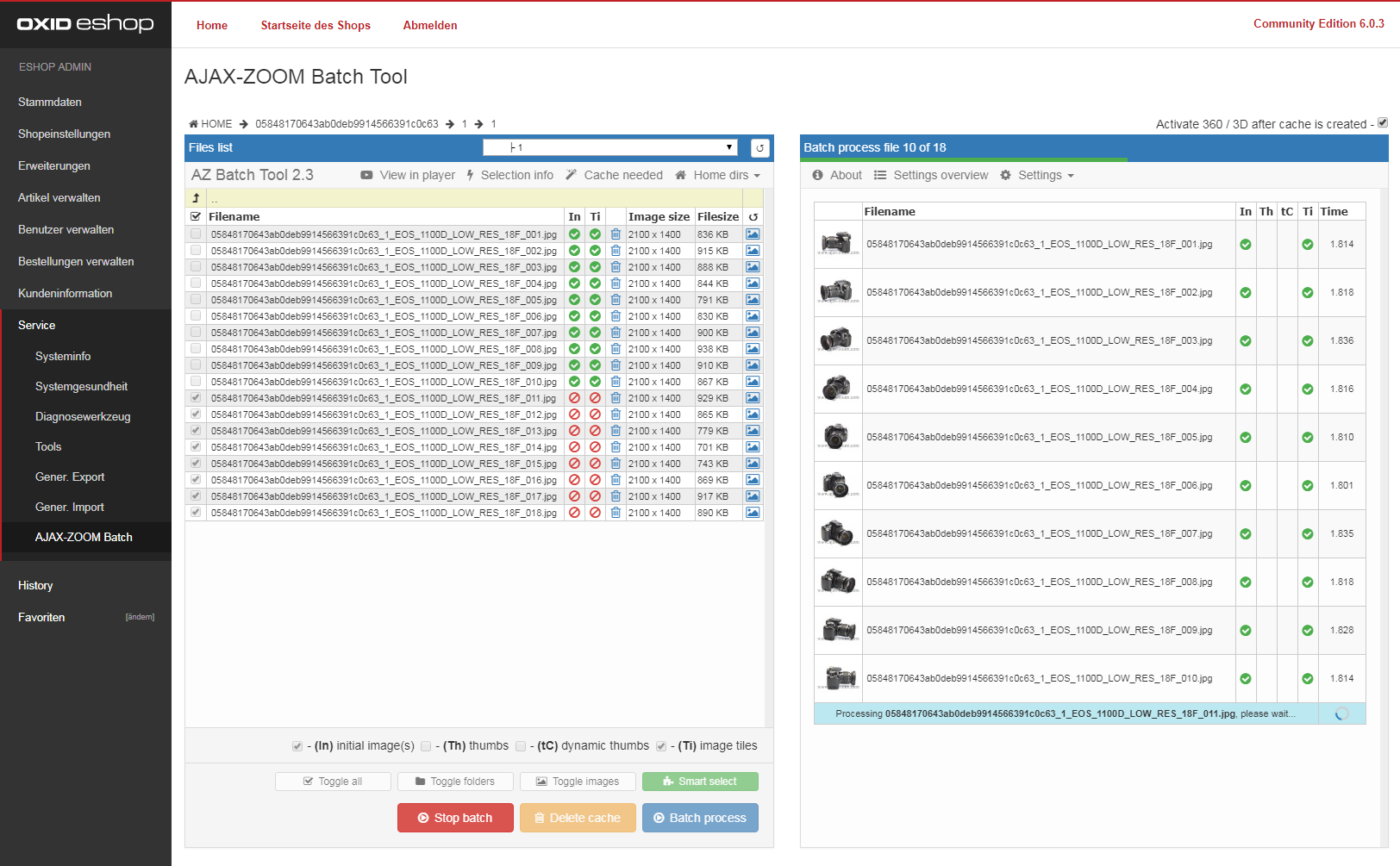 However, if you have thousands of images, it is a good idea to batch process all existing images, which you plan to show over AJAX-ZOOM, before launching the new website or before enabling AJAX-ZOOM at frontend. With this latest batch file, it is possible to cover up to 100% of all caches, which AJAX-ZOOM will generate on-the-fly if not present.